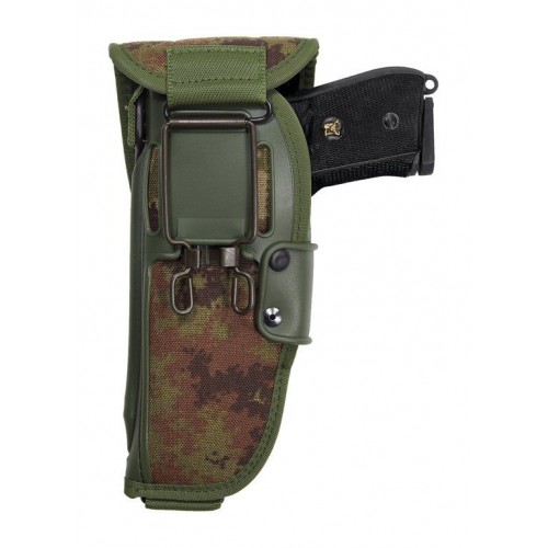 Fondina military ambidestra in cordura e polimero ad iniezione. Pattina a sgancio rapido. Passante amovibile in acciaio. Asole per cinture h 4 cm. Bacchetta di pulizia della canna inserita nella fessura frontale. Copertura del ponticello dell’arma. Possibilità di inserimento dello sgancio rapido (incluso). Optional: kit cosciale 2K13, kit ascellare 2K11.